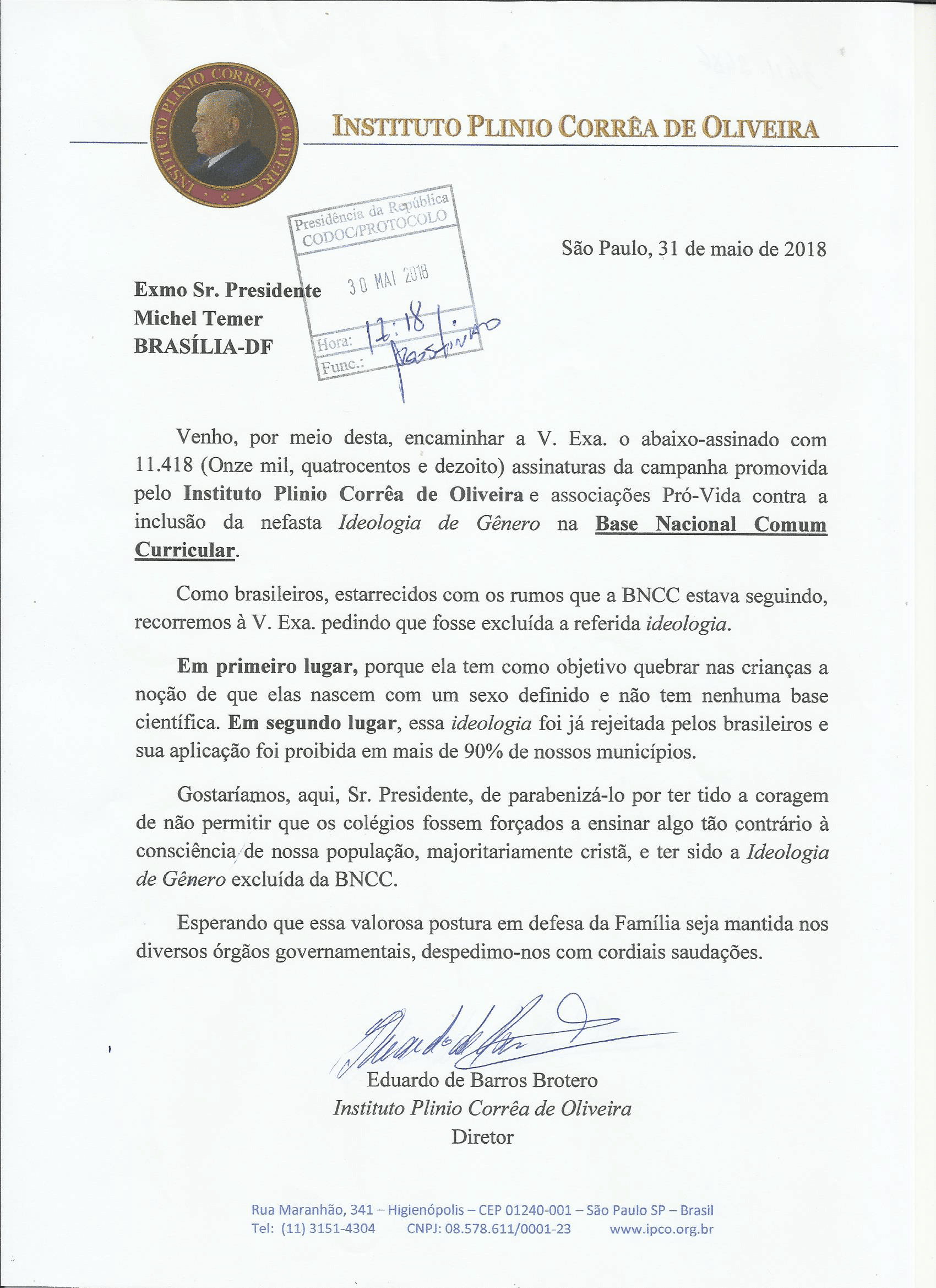 O Instituto Plinio Corrêa de Oliveira e associações Pró-Vida encaminharam ao Presidente Michel Temer um abaixo-assinado com 11.418 assinaturas resultantes da campanha promovida contra a inclusão da Ideologia de Gênero na Base Nacional Comum Curricular.
