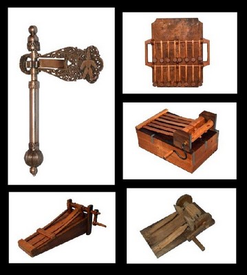 As matracas [alguns exemplares ao lado], confeccionadas em geral só com madeira, podem ser de diversos tipos e tamanhos. Elas têm manivelas e rodas, ou um pivô em torno do qual são acionadas. Há imaginação para tudo.