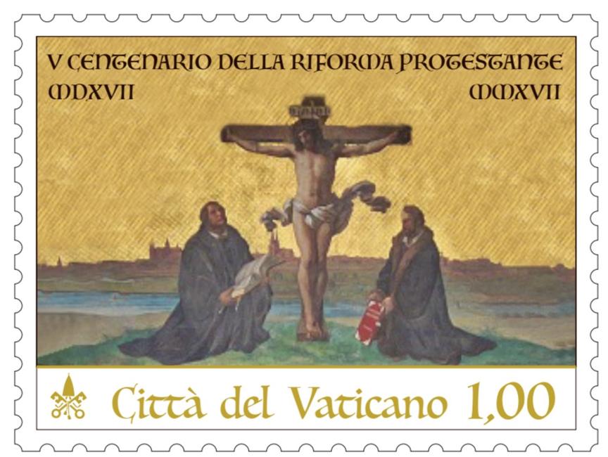 O Vaticano lançou hoje um selo comemorativo do V centenário da Reforma Protestante! A estampilha tem como fundo a cidade Wittenberg, berço da heresia luterana, no centro um crucifixo, à esquerda a figura de Lutero (portando a bíblia traduzida e deformada por ele), e à direita seu comparsa na expansão da Revolução Protestante, Melanchton (portando a “Confissão de Augsburgo” — o primeiro documento oficial dos princípios do protestantismo) [foto ao lado].