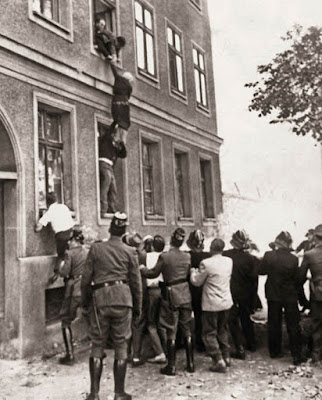 Do que seja a atmosfera moral trágica em que essas evasões se desenrolam dão testemunho os clichês desta página. Em um deles vemos uma anciã de 78 anos, residente em uma casa situada no setor soviético de Berlim, cujas janelas se abriam para o setor ocidental. A pobre setuagenária resolveu saltar a janela do segundo andar, firmando-se no friso existente junto à mesma, e daí jogar-se em uma rede que bombeiros desdobravam a seus pés. Alguns comunistas, tomando conhecimento do fato, tiveram a covardia de tentar reter a anciã pelo braço. Por fim, ela se desvencilhou, com a ajuda de populares, e conseguiu cair sobre a rede em condições satisfatórias.
