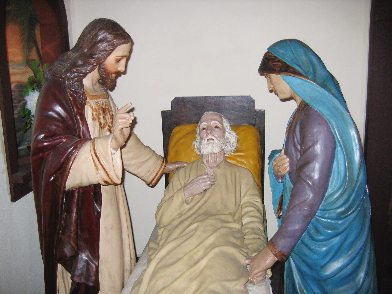 Este conjunto escultural interpreta muito bem a morte de São José, no transe de quem já está agonizando. Ele sofre as dores da morte, mas numa atitude de quem sabe que se encontra assistido pela Santíssima Virgem e por Nosso Senhor. São José tem conhecimento de que está tendo contato com o próprio Deus e com sua Virginal Esposa e a noção de que isso já é o Céu!