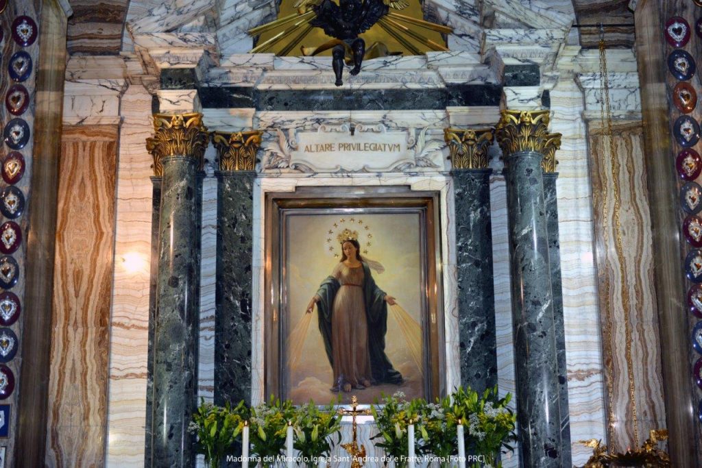 Todo mundo conhece os santuários marianos de Loreto e Pompéia e, em Roma, as grandes basílicas, mas nem todo mundo sabe que no coração da cidade eterna existe uma pequena basílica paroquial, Sant’Andrea delle Fratte, também conhecida como Santuário de Nossa Senhora do Milagre [foto acima]. Aqui, de fato, em 20 de janeiro de 1842, Nossa Senhora apareceu ao judeu Alfonso Ratisbonne e o converteu instantaneamente. Uma placa colocada em um dos pilares da capela da aparição comemora o evento da seguinte forma: