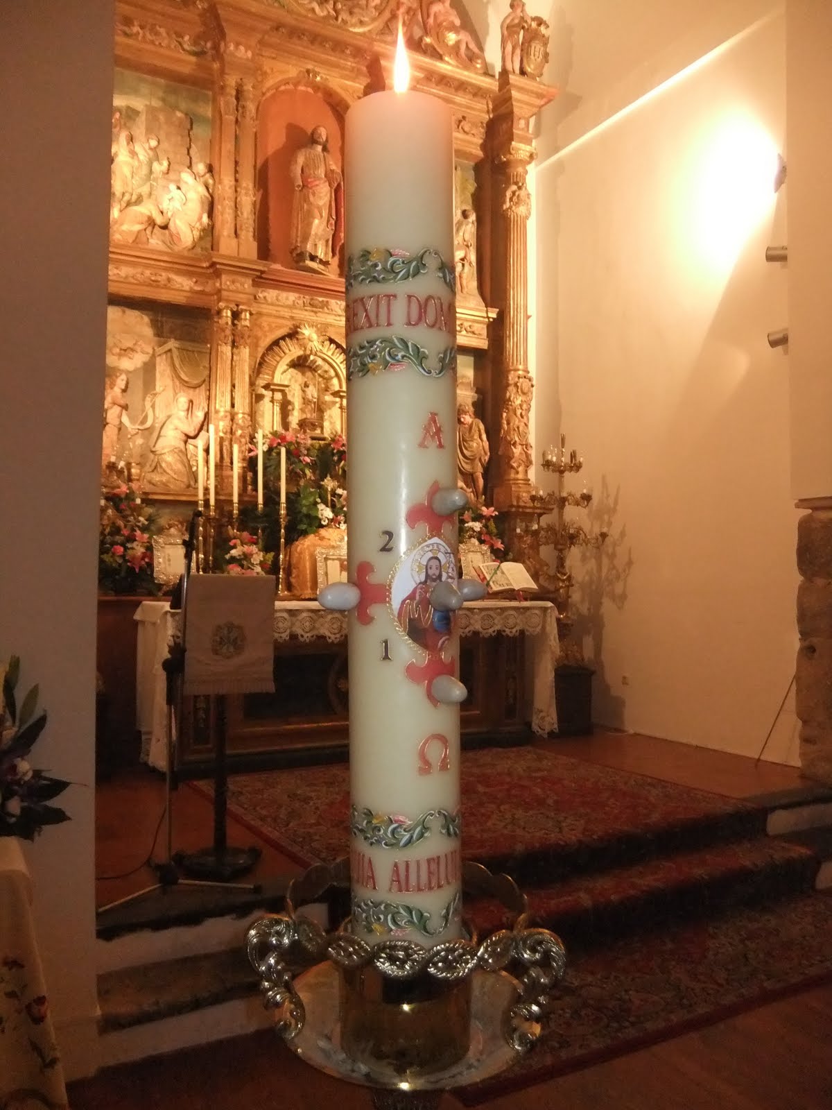 O círio Pascal com cinco cravos lembra as cinco chagas de Nosso Senhor ressuscitado. Com a Cruz recorda a nossa redenção.