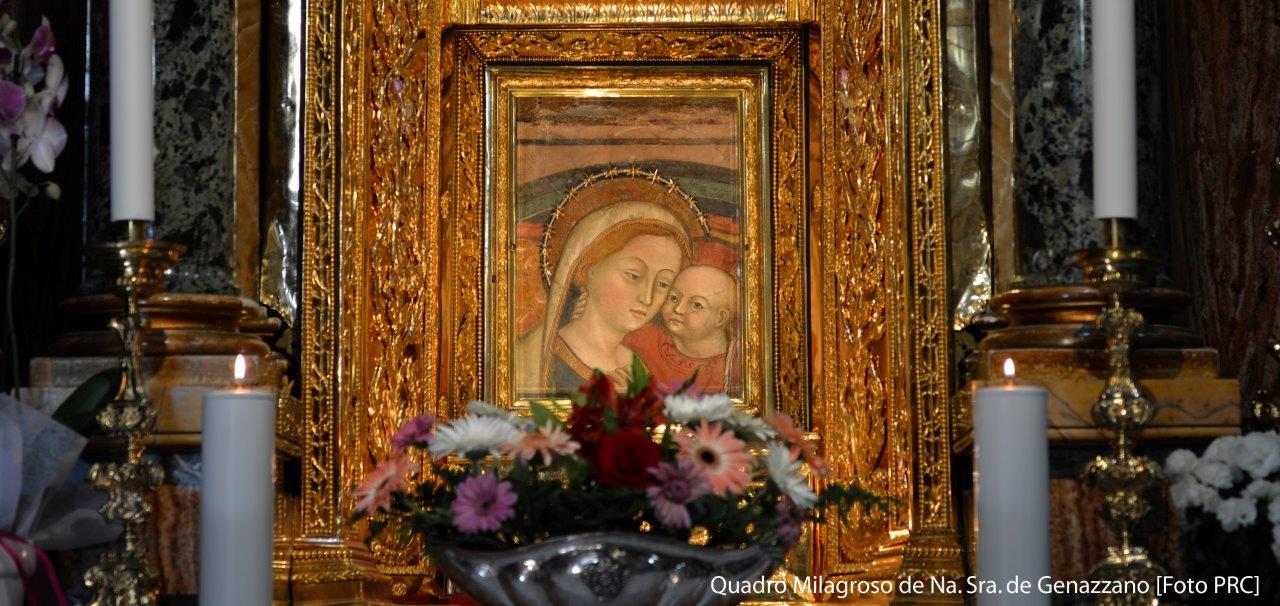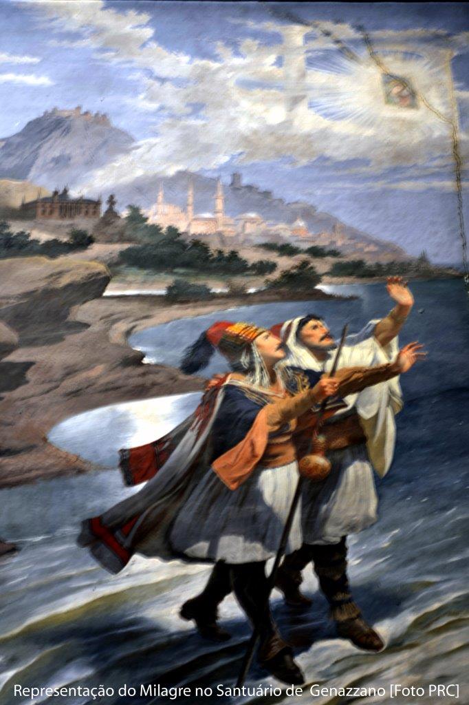 Quando rezavam fervorosamente diante da Mãe de Deus, sua santa imagem desprendeu-se da parede onde estava, e começou a flutuar em direção ao Mar Adriático. Os dois fiéis albaneses a seguiram, atravessando a pé enxuto o oceano, até atingir Roma [representação ao lado]. Souberam então que uma misteriosa representação da Virgem, vinda do céu, pousara num altar de uma igreja inacabada na cidade de Genazzano (Itália). Para lá foram eles, reconhecendo, assim que chegaram, a celeste Senhora de seu país. O afresco passou a ser conhecido pela famosa invocação de Nossa Senhora do Bom Conselho de Genazzano [Quadro abaixo].