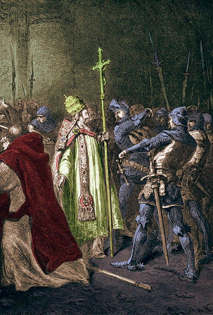 Secundado por Sciarra Colonna, inimigo figadal do Papa, Nogaret surpreendeu Bonifácio em Anagni, e quiseram obrigá-lo a renunciar.