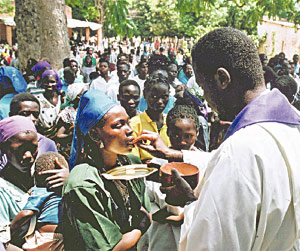 | Mesmo perseguidos, católicos recebem a comunhão no Sudão, país de religião predominantemente muçulmana |