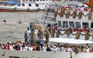 3) Romaria fluvial [foto ao lado] durante a qual a imagem é levada de barco pela baía de Guajará em direção a Belém; 4) Moto-romaria do cais de Belém, na qual a imagem, em carro aberto, é seguida por motoqueiros até um colégio no centro de Belém, onde é celebrada uma missa;