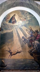 Em 1182, o nobre português Dom Fuas Roupinho participava de uma caçada naquele pico. Ao perseguir um cervo, seu cavalo esteve a ponto de cair em um precipício, quando ele invocou Nossa Senhora e foi salvo [quadro ao lado]. Em ação de graças, mandou edificar no local a Capela da Memória, onde os operários encarregados da construção descobriram a imagem. A notícia se espalhou, atraindo muitas pessoas, que passaram a acorrer ao local para venerá-la, operando-se muitos milagres.