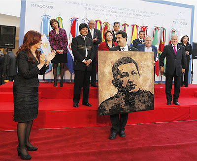 Temendo talvez algum fenômeno análogo de opinião pública em seus países, presidentes membros do Mercosul reunidos em Mendoza (Argentina) [foto acima] suspenderam o Paraguai da aliança e decidiram receber a Venezuela de Hugo Chávez como novo membro. O parlamento do Paraguai opunha-se há anos a esse ingresso, e agora presidentes “populistas” aproveitaram-se daquela suspensão para abrir as portas ao líder “bolivariano”. O ato foi claramente ilegal, violando numerosos tratados assinados pelo Brasil, como demonstrou o ex-chanceler brasileiro Celso Lafer. Para ele, o ato de Mendoza “carece de boa-fé […] lealdade e honestidade […]. Trata-se, em síntese, de uma ilegalidade”.(2)