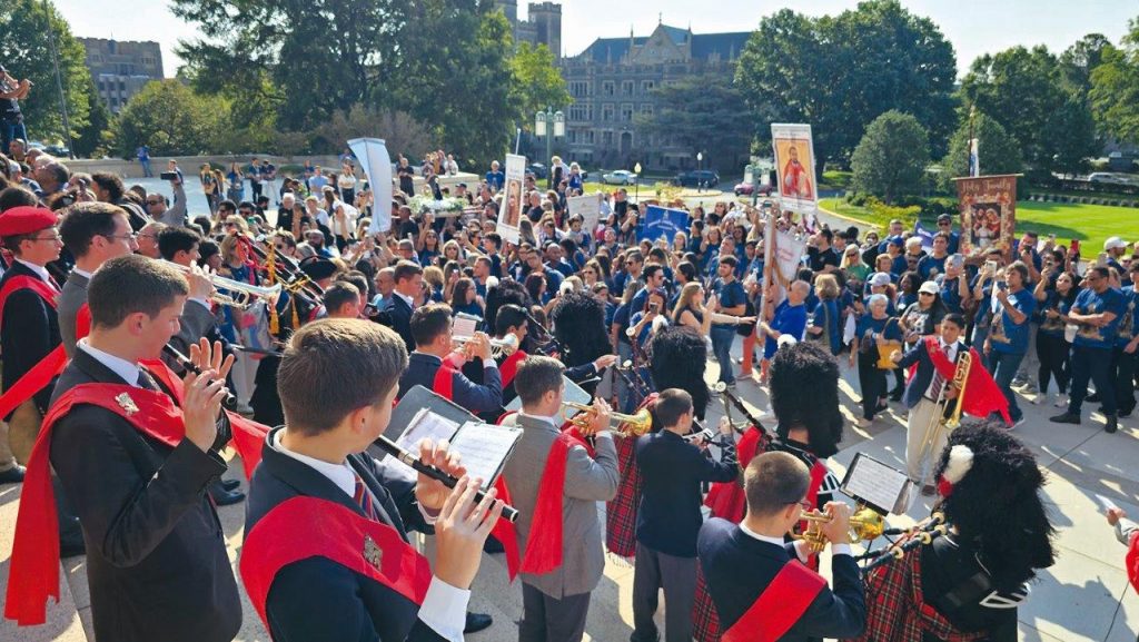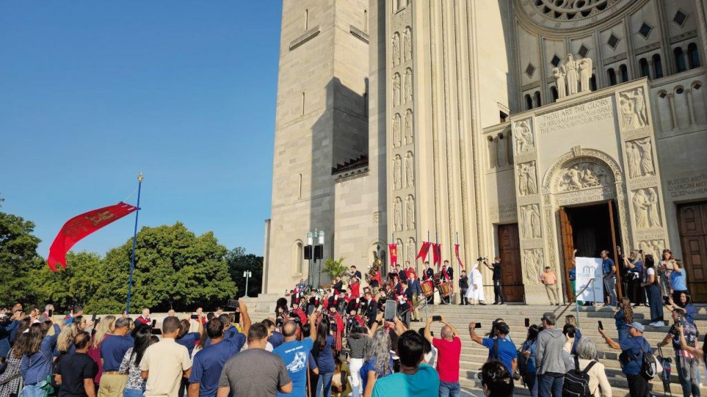 Quando os peregrinos chegaram aos degraus da Basílica de Washington, a banda da TFP americana e da Academia St. Louis de Montfort os recebeu com hinos emocionantes. Trompetistas, bateristas, pífaros e até gaiteiros em trajes escoceses completos homenagearam Nossa Senhora de maneira especial.