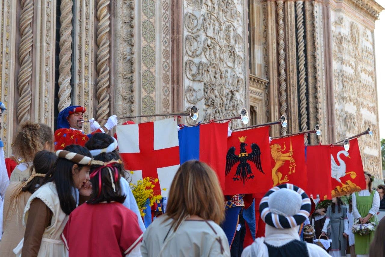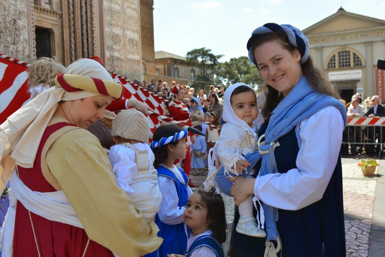 quatro bairros da cidade, cada um com suas bandeiras e cores próprias. Muitos dos hábitos medievais usados no cortejo são confeccionados em riquíssimos tecidos, alguns de seda e veludo, outros bordados em ouro e prata — como se pode observar nas fotos. Alguns trajes constituem verdadeiras obras de arte confeccionadas pela célebre “Manifattura LISIO”.