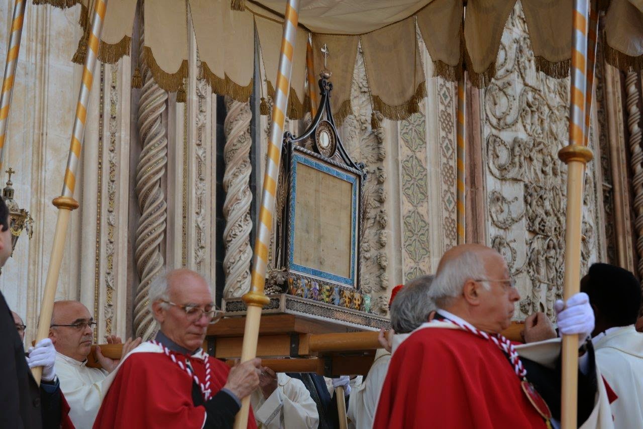 O sacrossanto Corporal, levado num andor, sob um belo pálio, na procissão de Corpus Christi em Orvieto
