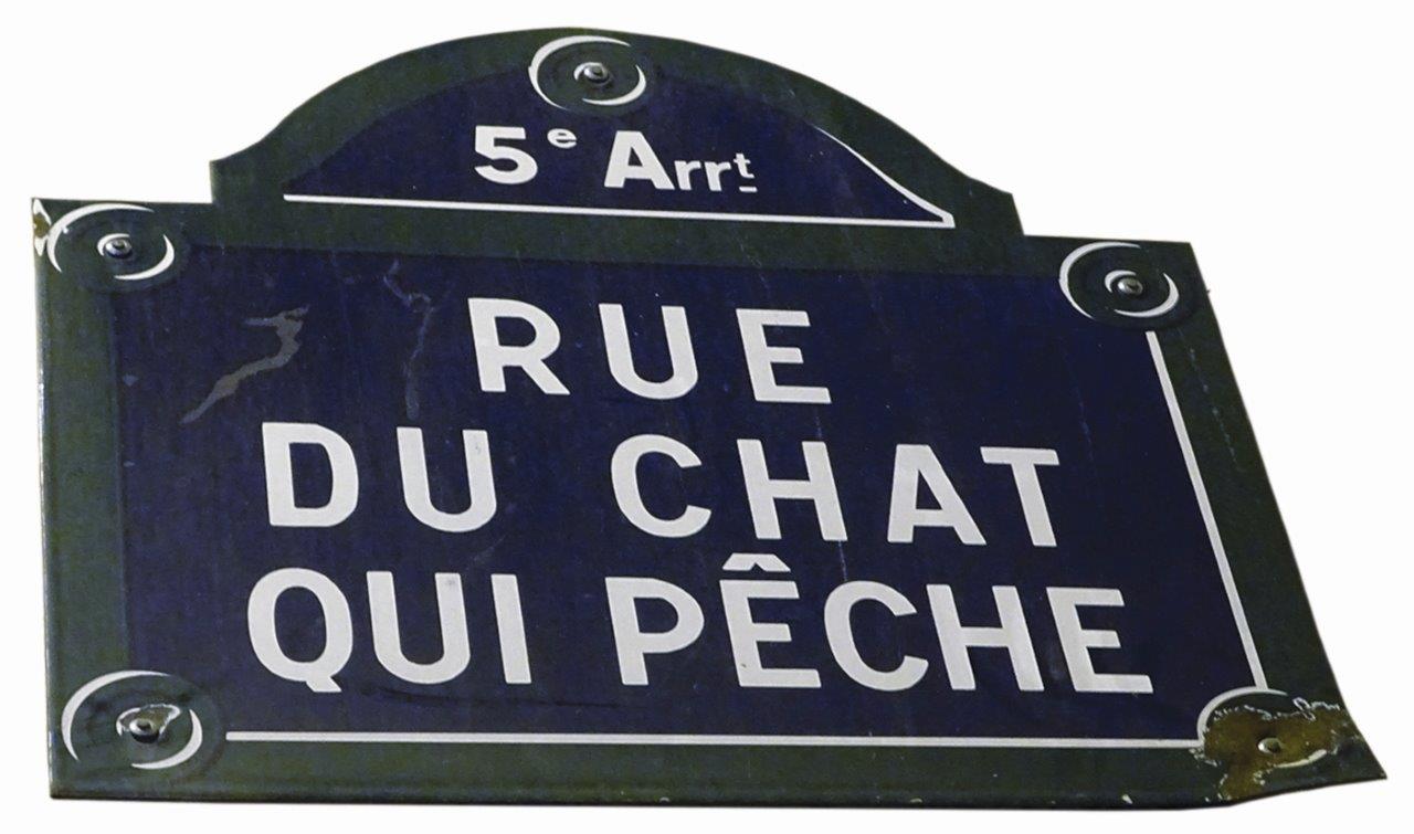 Outra é a do gato que sobe no aquário e fica observando os movimentos do peixinho. Quando ele está numa posição conveniente, o gato mete rapidamente a pata e joga o nadador para fora da água, depois dá um salto felino e o apanha. Há em Paris uma Rue du Chat-qui-Pêche (Rua do gato que pesca) [foto abaixo], em memória de um gato que sobressaiu-se nessa habilidade no rio Sena, e era espetáculo gratuito para muitos, a ponto de merecer essa homenagem da municipalidade.