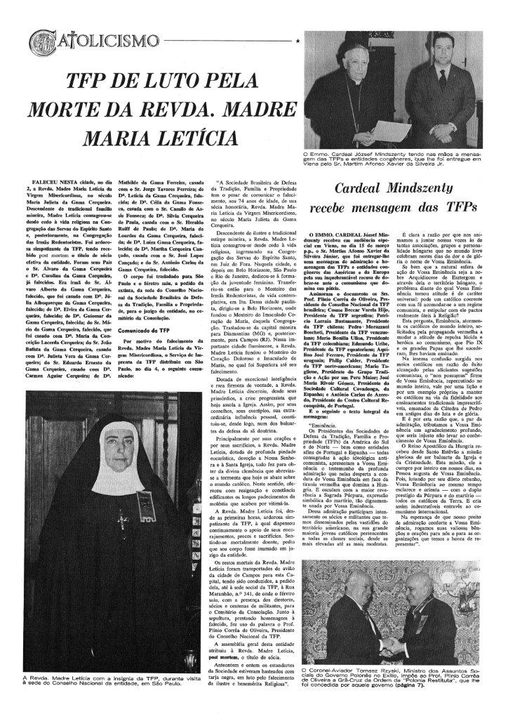 Madre Maria Letícia da Virgem Misericordiosa, OSSR., Superiora do Mosteiro do Coração Doloroso e Imaculado de Maria, foi uma grande admiradora da revista Catolicismo, por cujos colaboradores, muito especialmente por Plinio Corrêa de Oliveira, bem como pelos membros da TFP, rezava especialmente.