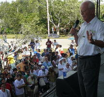 | Pe. Comblin pregando para membros de uma CEBs, num palanque maior que a parte ocupada pelo público |