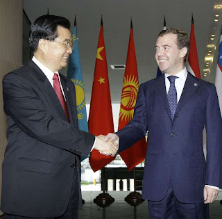 A Rússia, quatro repúblicas da ex-URSS e a China assinaram acordo em Astana, capital do Cazaquistão, contra o projeto defensivo americano de antimísseis, que deveria ser instalado na Europa. Na ocasião, o presidente russo, Dmitri Medvedev [na foto com Hu Jintao], ameaçou ressuscitar a corrida armamentista como ocorreu durante a Guerra Fria. Na verdade, a Rússia teme que o escudo antimíssil americano, oficialmente voltado contra a ameaça iraniana, neutralize os foguetes atômicos russos e impossibilite Moscou de lançar uma cartada decisiva contra o Ocidente num futuro — mas não tão improvável — conflito. E Pequim apressou-se a apoiar o Kremlin, como na trágica época de Stalin, Brejenev e Mao Tsé-tung.