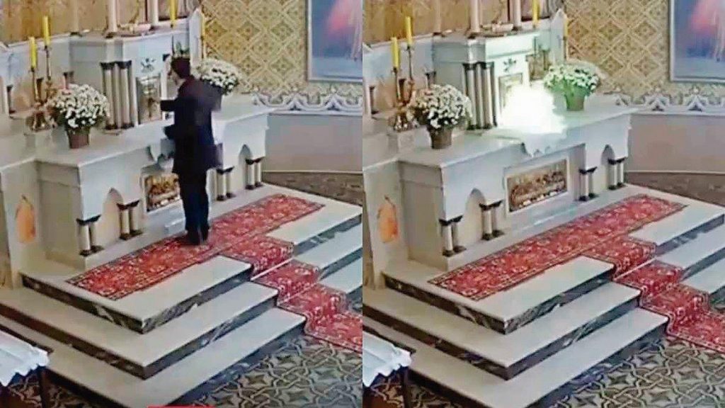 Câmeras de segurança registraram um homem deixando o artefato sobre o altar-mor e sua explosão [foto acima].