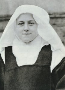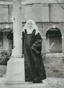 É a fotografia dela com véu de noviça, em pé, abraçando a cruz que há no pátio interior do Carmelo. A freira que era sua professora no colégio das Beneditinas de Lisieux [foto ao lado], onde Santa Teresinha estudou, disse que aquela foto era a de que mais gostava, porque nela aparecia o sorriso que ela sempre tinha e que em nenhuma das outras fotos aparece.
