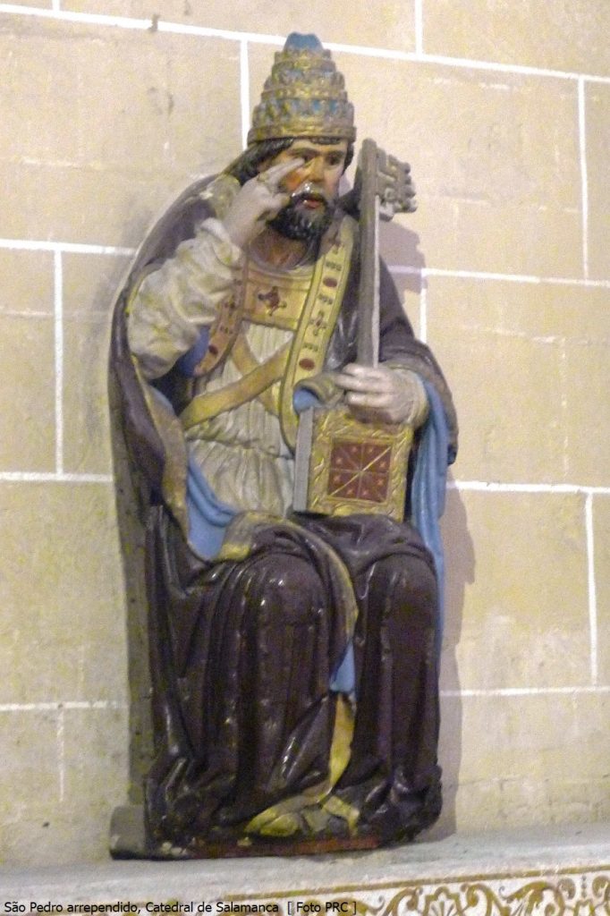 Perdido em si mesmo, entre sentado e ajoelhado, sustentando a cabeça pensativa com o braço que se apoia sobre o joelho esquerdo, o robusto pescador da Galileia mostra-se dominado por profundíssimo arrependimento.