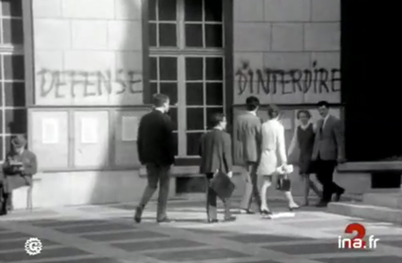 Na parede da Sorbonne, pichado o lema contestatário: “Défense d’interdire!” (É proibido proibir!)