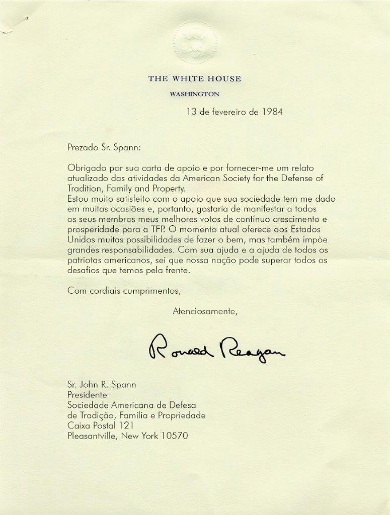 Fac-sílime, traduzido para o português, de carta enviada pelo Presidente Ronald Reagan para a TFP americana.